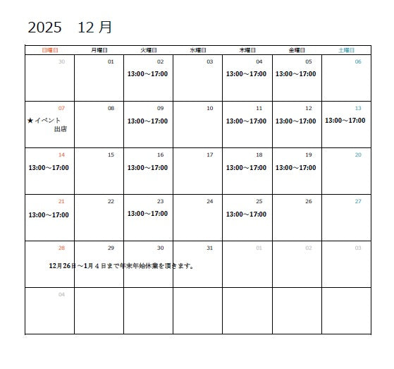12月26日~1月4日は年末年始のお休みを頂きます。